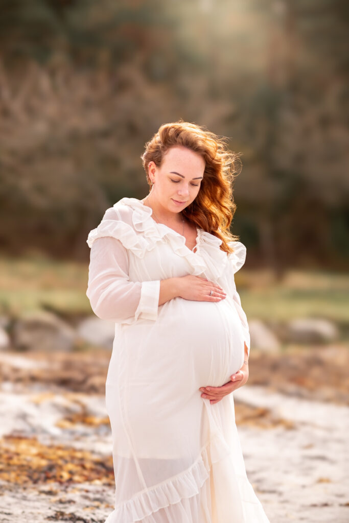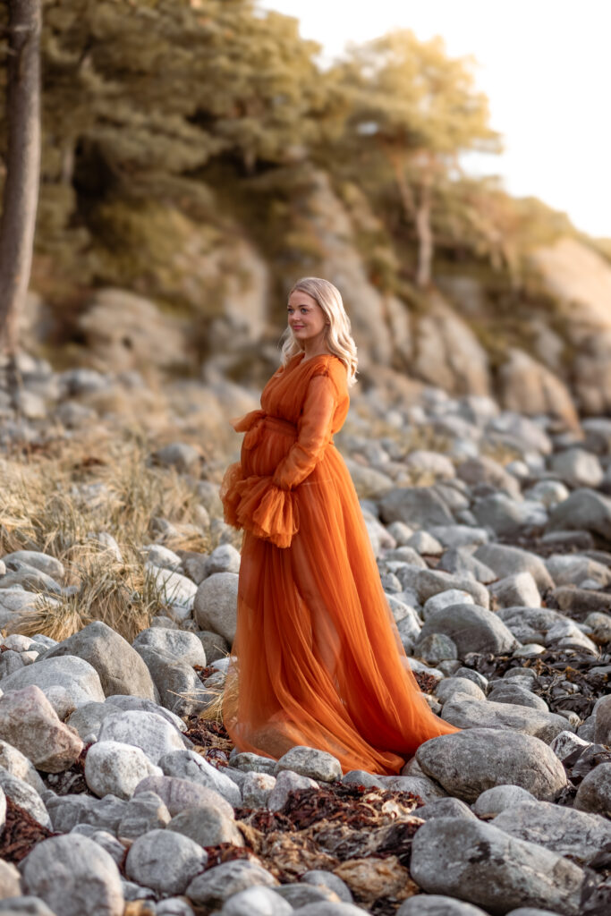 Gravidfoto passer nydelig ute i naturen – særlig i mykt kveldslys. Vi kan fotografere ved sjøen, på svaberg, i skogen eller et sted som betyr noe for deg. Jeg har også noen favorittplasser og kommer gjerne med anbefalninger.